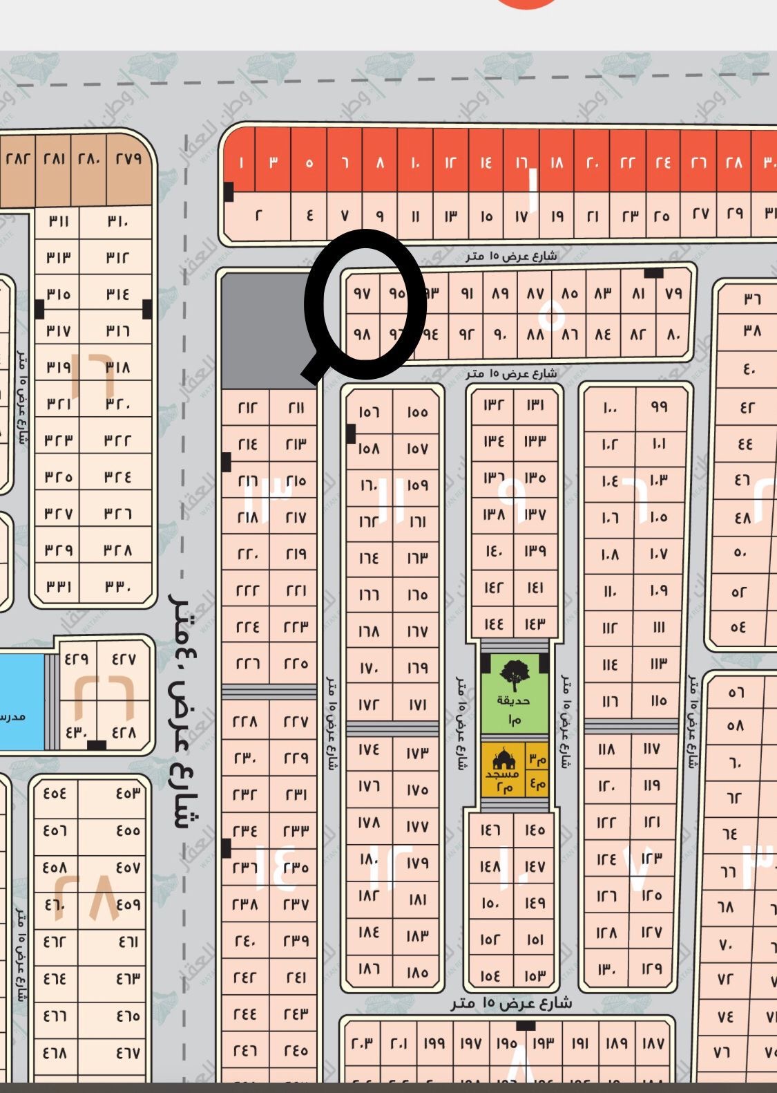 نوع العقار أرض للبيع التصنيف سكنية الحي - المخطط جوهرة الهادي رقم الأرض 97 شارع عرض 15*15 المساحة 466م السعر المتر 1,600